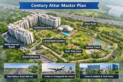 The Century Attur Master Plan reflects thoughtful urban planning with a clear focus on space, light, movement, and long-term livability. Located in the fast-growing belt of Yelahanka, North Bengaluru, the project balances residential comfort with seamless city access.
